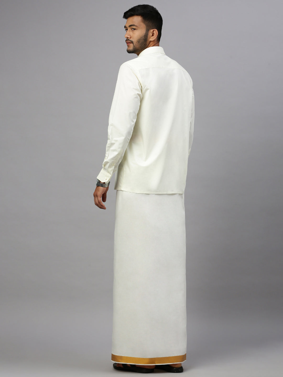 Men 100% Cotton Double Layer Cream Dhoti with 2" Jari Border Gold Fine Plain