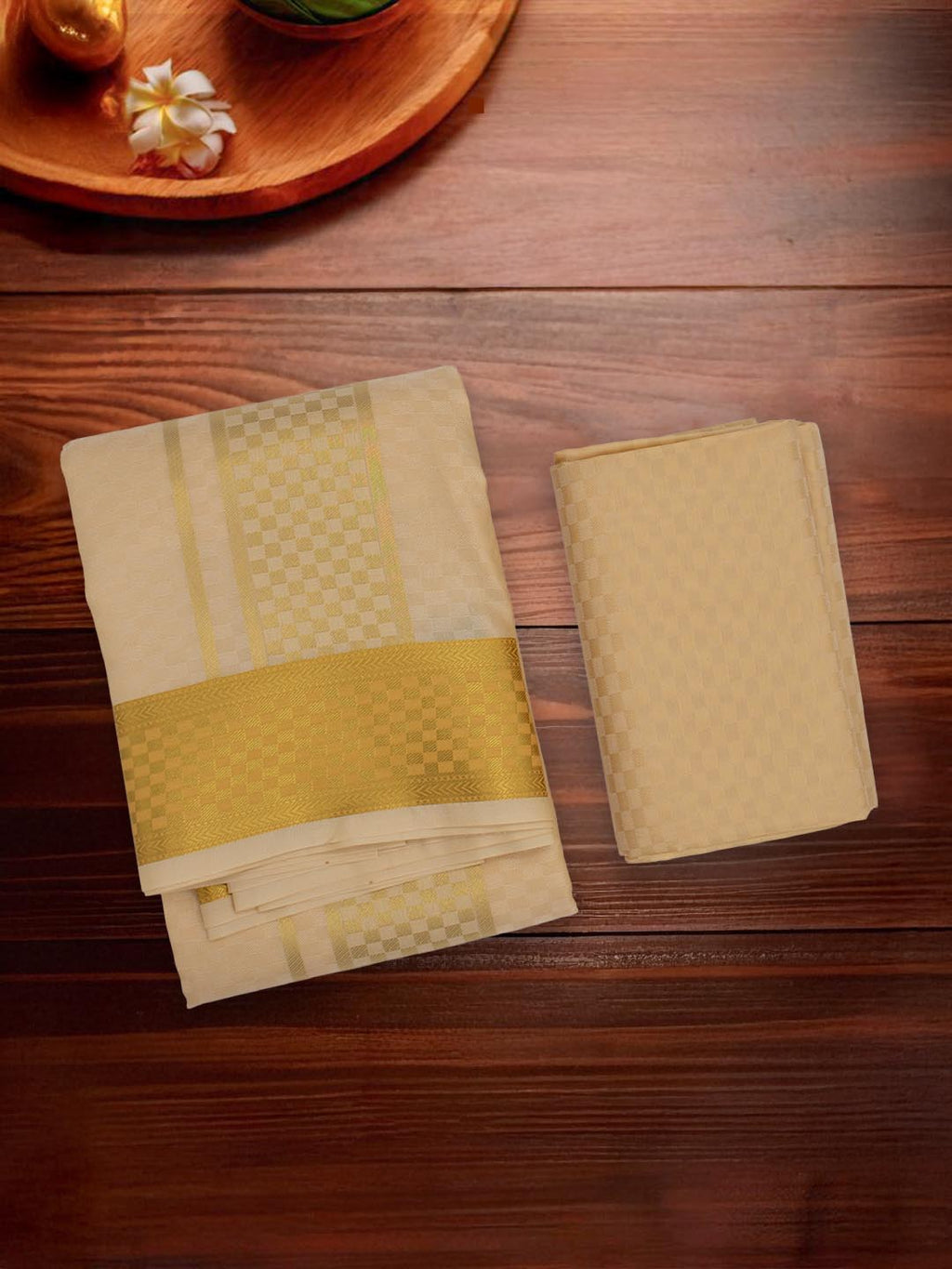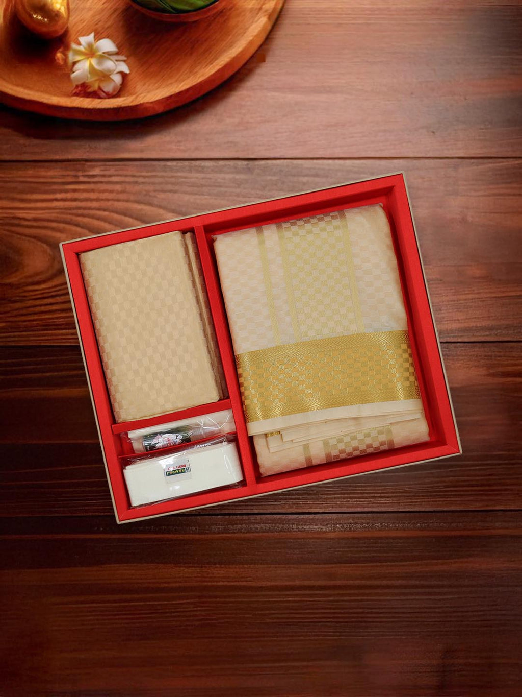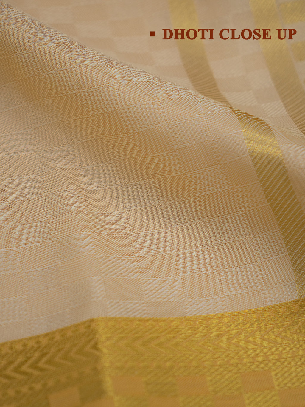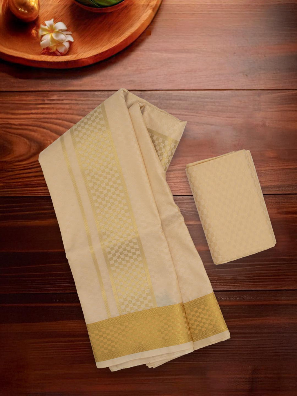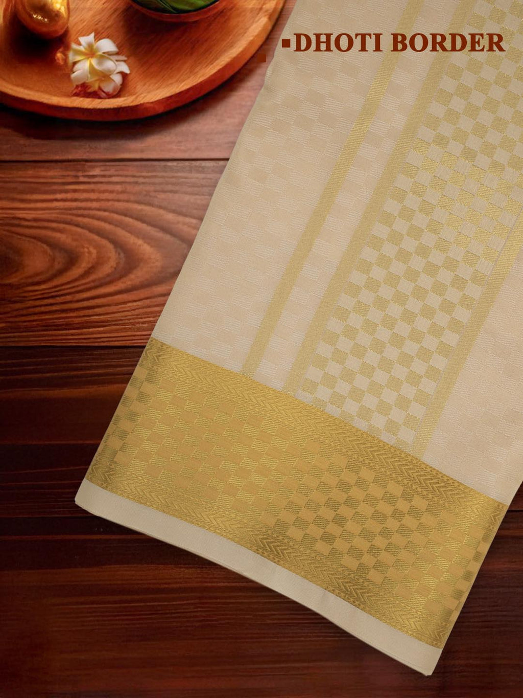 Elevate your traditional look with this Men’s Art Silk Dhoti & Shirting Set, featuring a rich self-design pattern and an elegant gold fancy jari border. Crafted from premium art silk for a smooth, lustrous finish, this set offers a perfect blend of comfort and style. Ideal for weddings, festive celebrations, and special occasions, it adds a refined touch to your ethnic wardrobe.