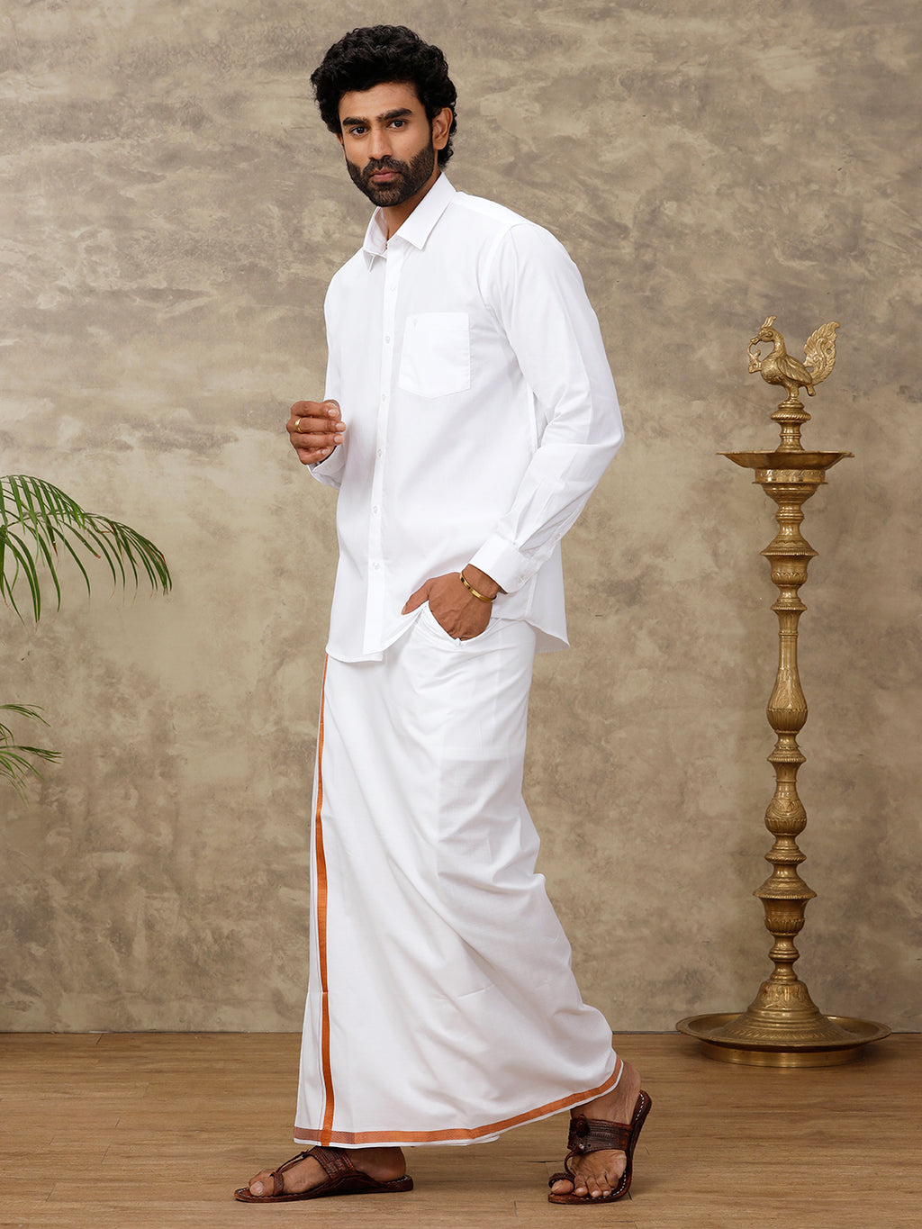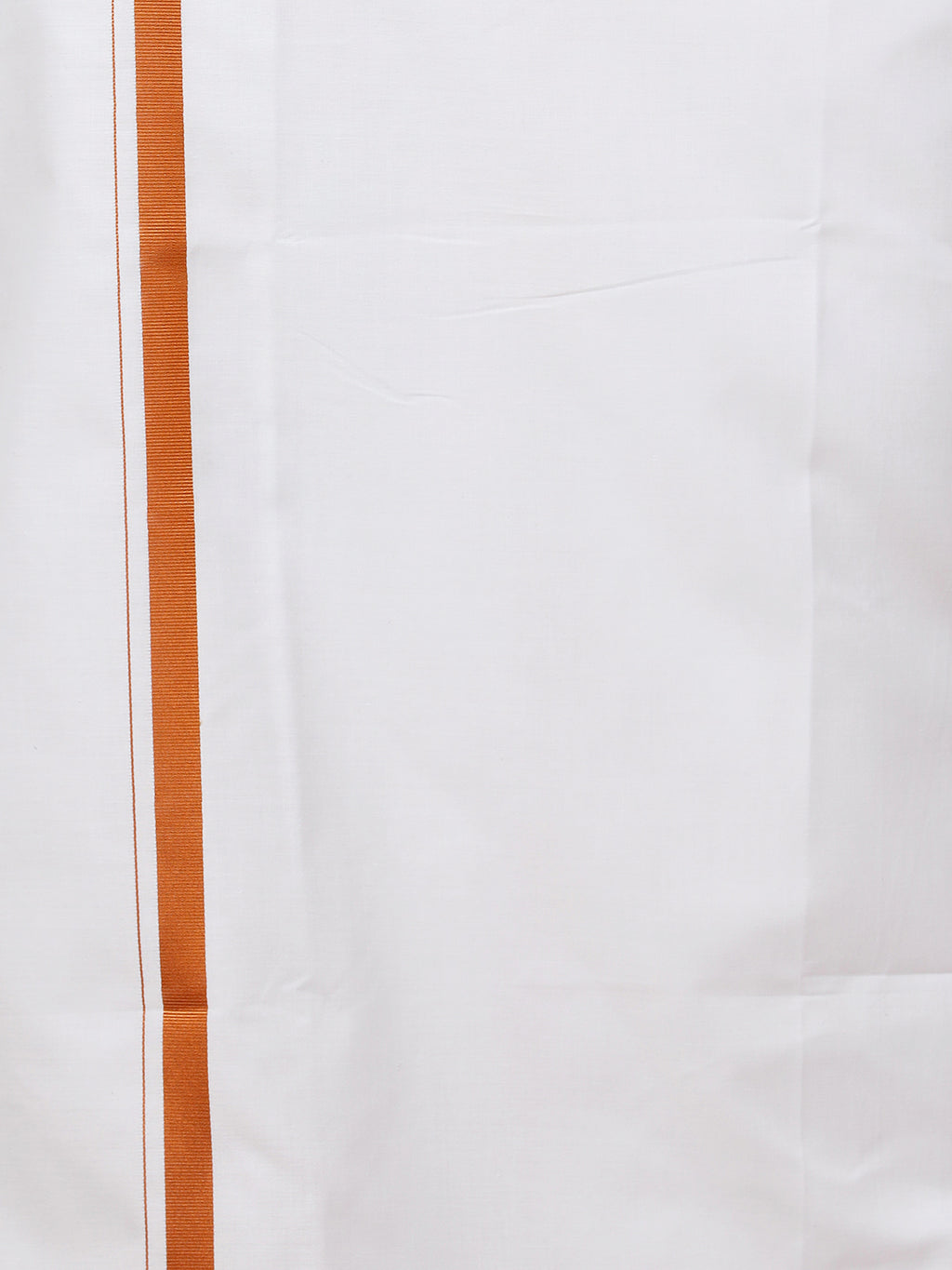 Men Cotton Blend Readymade Double Layer White Dhoti with 3/4" Copper Jari Border 248