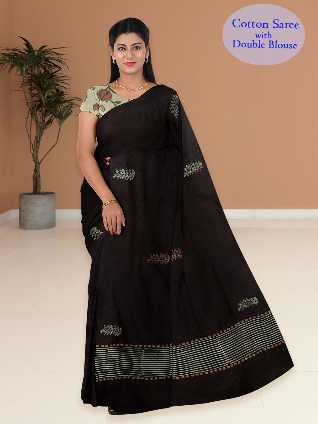 Women Black Cotton Saree with Double Blouse PCS215