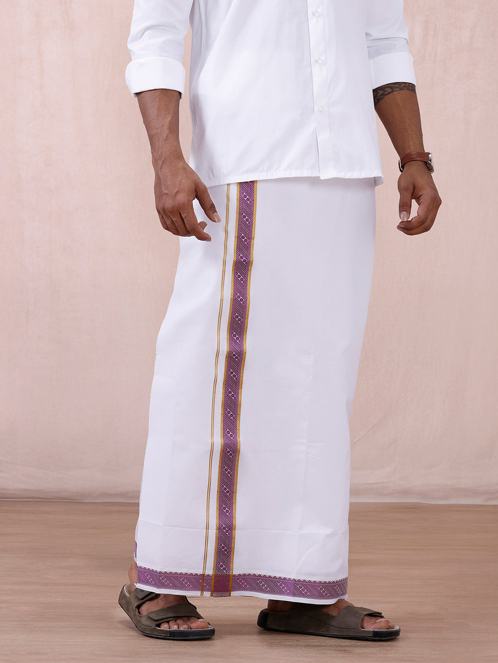 Experience timeless elegance with this 100% cotton single-layer white dhoti, designed for superior comfort and breathability. Featuring a refined fancy jari border, it adds a touch of sophistication and grandeur, making it ideal for religious, cultural, and festive occasions. A perfect blend of tradition, style, and everyday comfort.