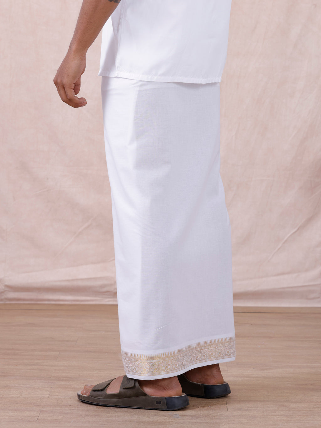 Men Cotton Blend Readymade Double Layer White Dhoti with Gold Jari Border GAA01