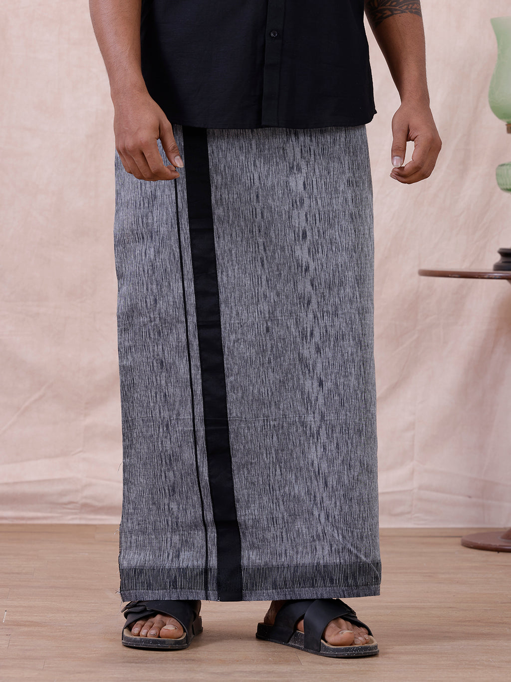 Make a refined style statement with this Men's Cotton Blend Single-Layer Grey Dhoti, elegantly designed with a decorative fancy border. The subtle grey tone offers a modern twist to traditional wear, while the soft and breathable cotton blend fabric ensures all-day comfort. Ideal for religious ceremonies, festive occasions, or cultural gatherings, this dhoti combines understated elegance with a touch of flair. The fancy border adds visual interest, making it a versatile addition to any ethnic wardrobe.