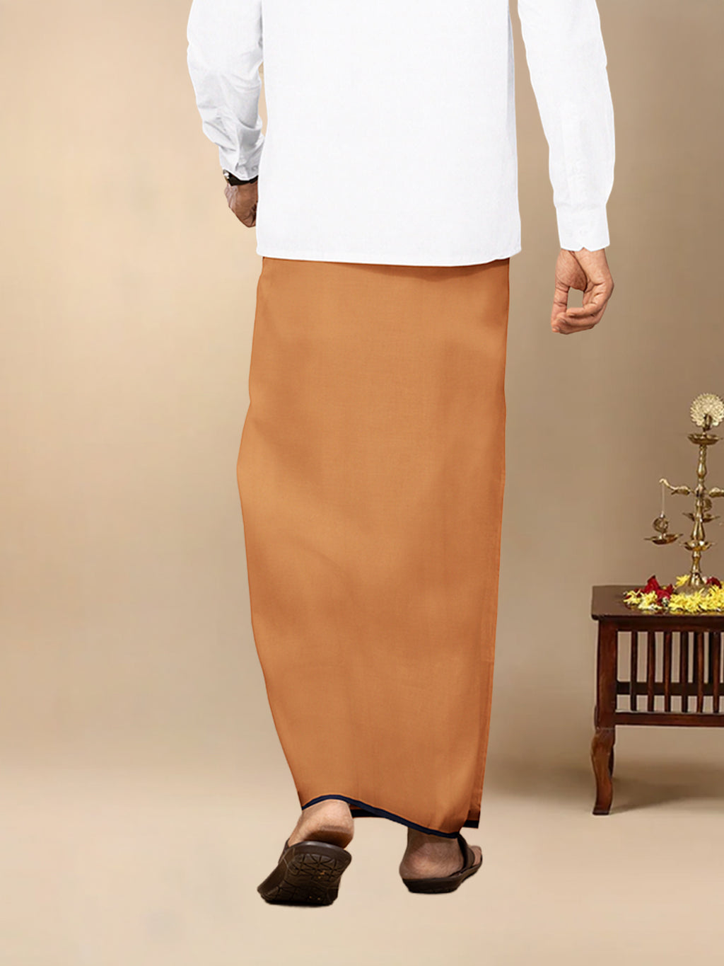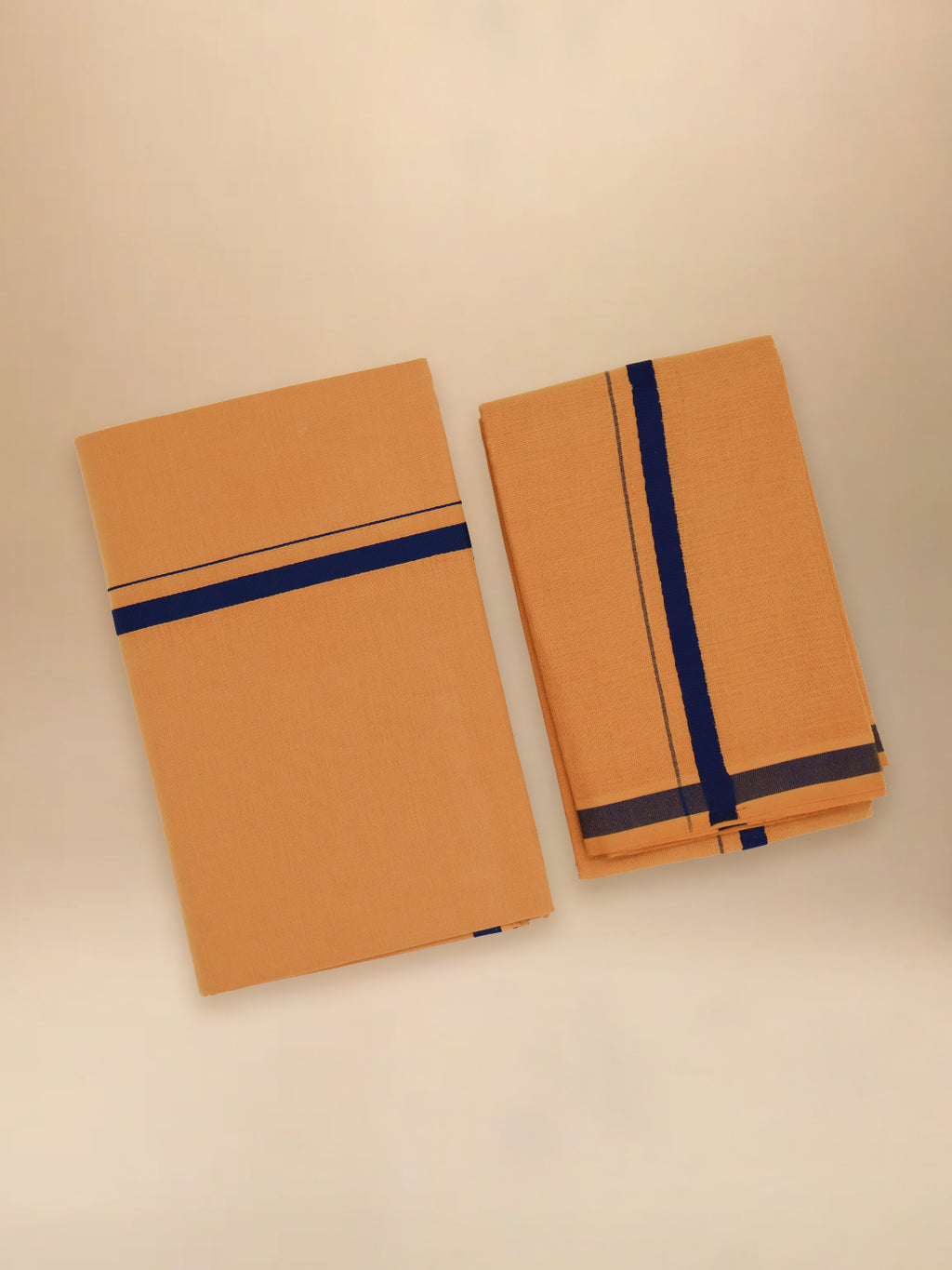 Men Cotton Blend Single Layer Kaavi Dhoti & Towel Set with Navy Border Poojan