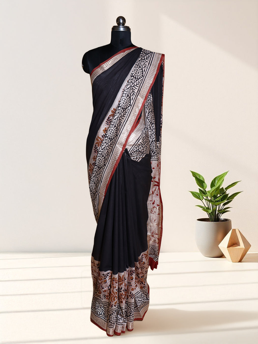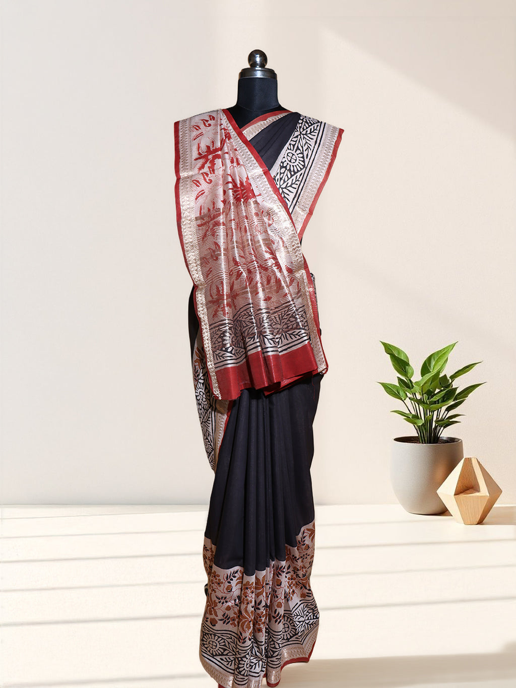 Women Black Semi Chanderi Cotton Printed Saree SC80