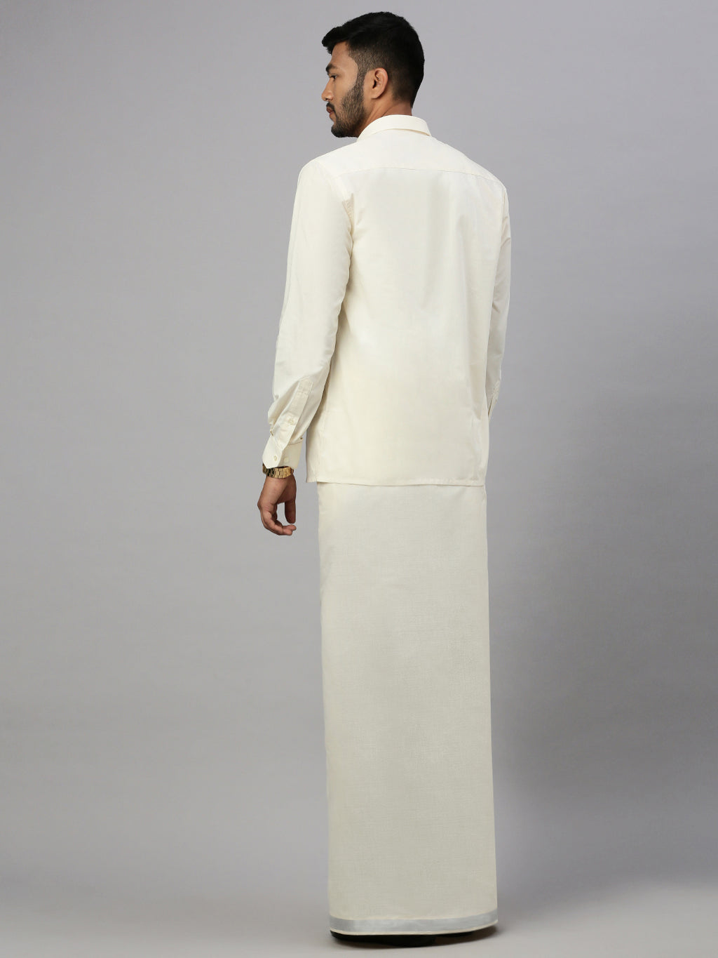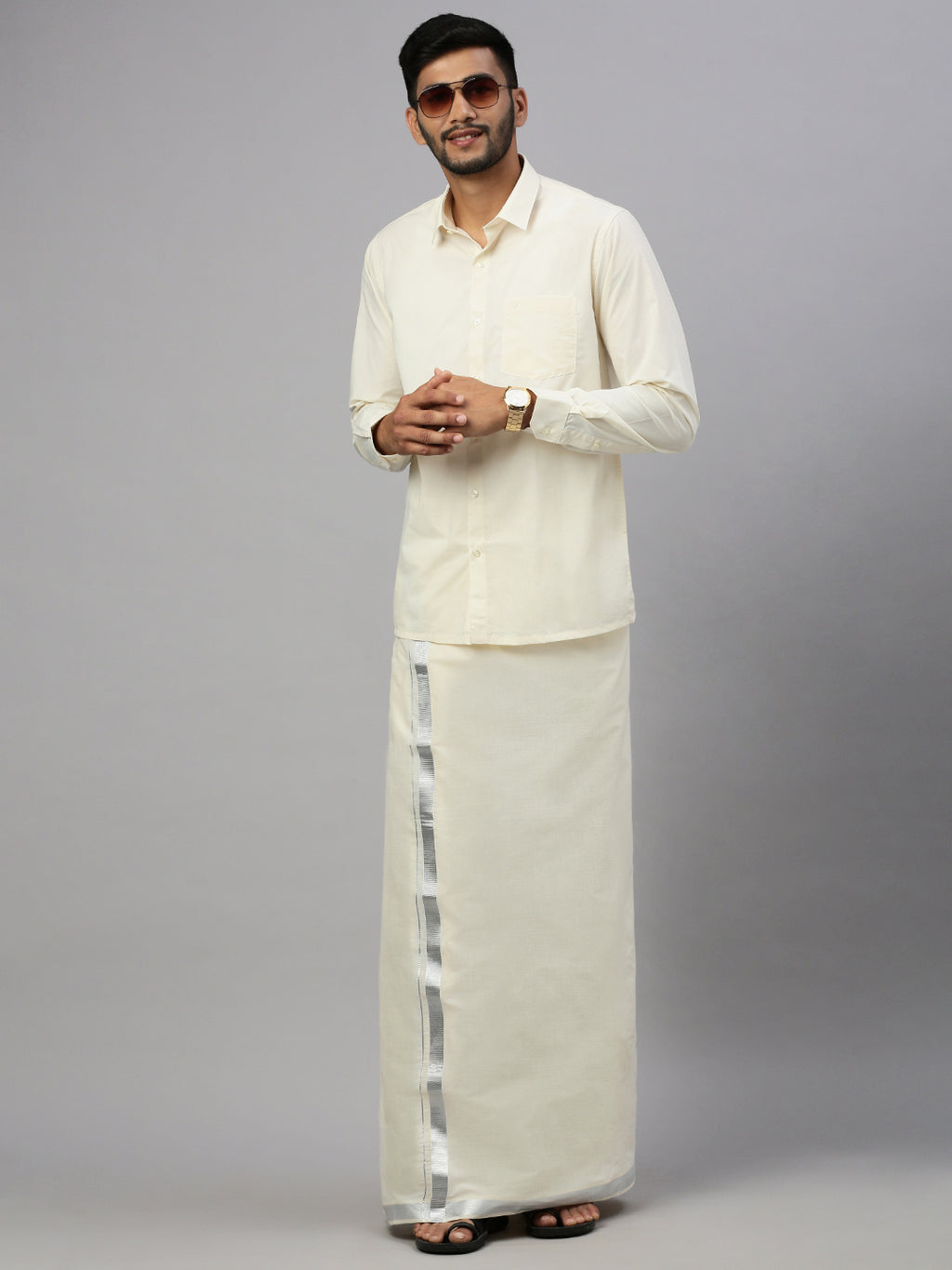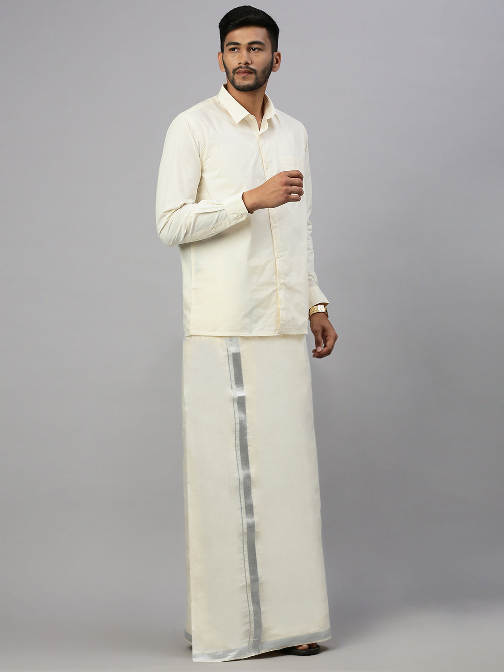 Men Kora Cotton Double Layer Dhoti with 1 1/2" Jari Border Silver Rose
