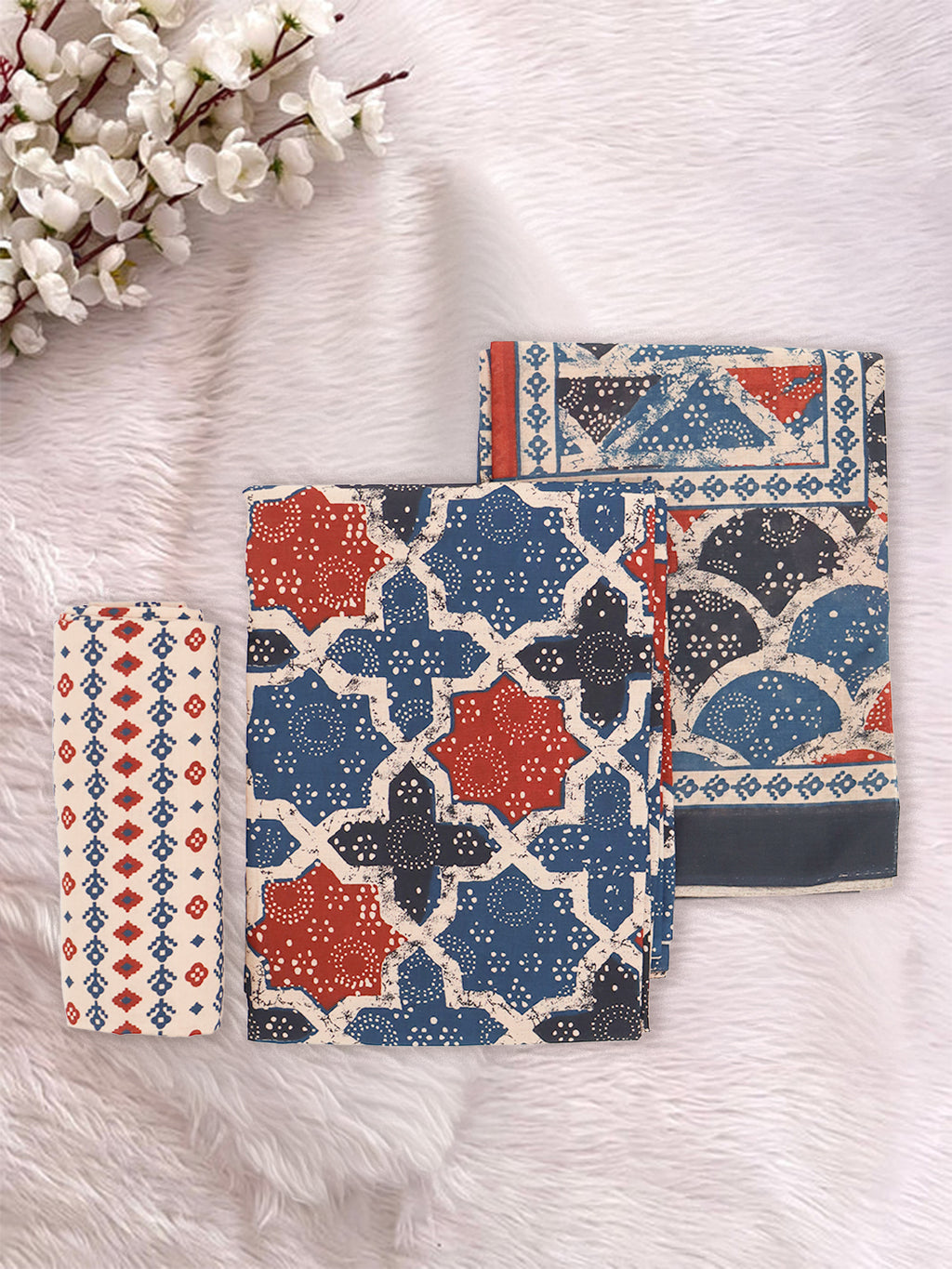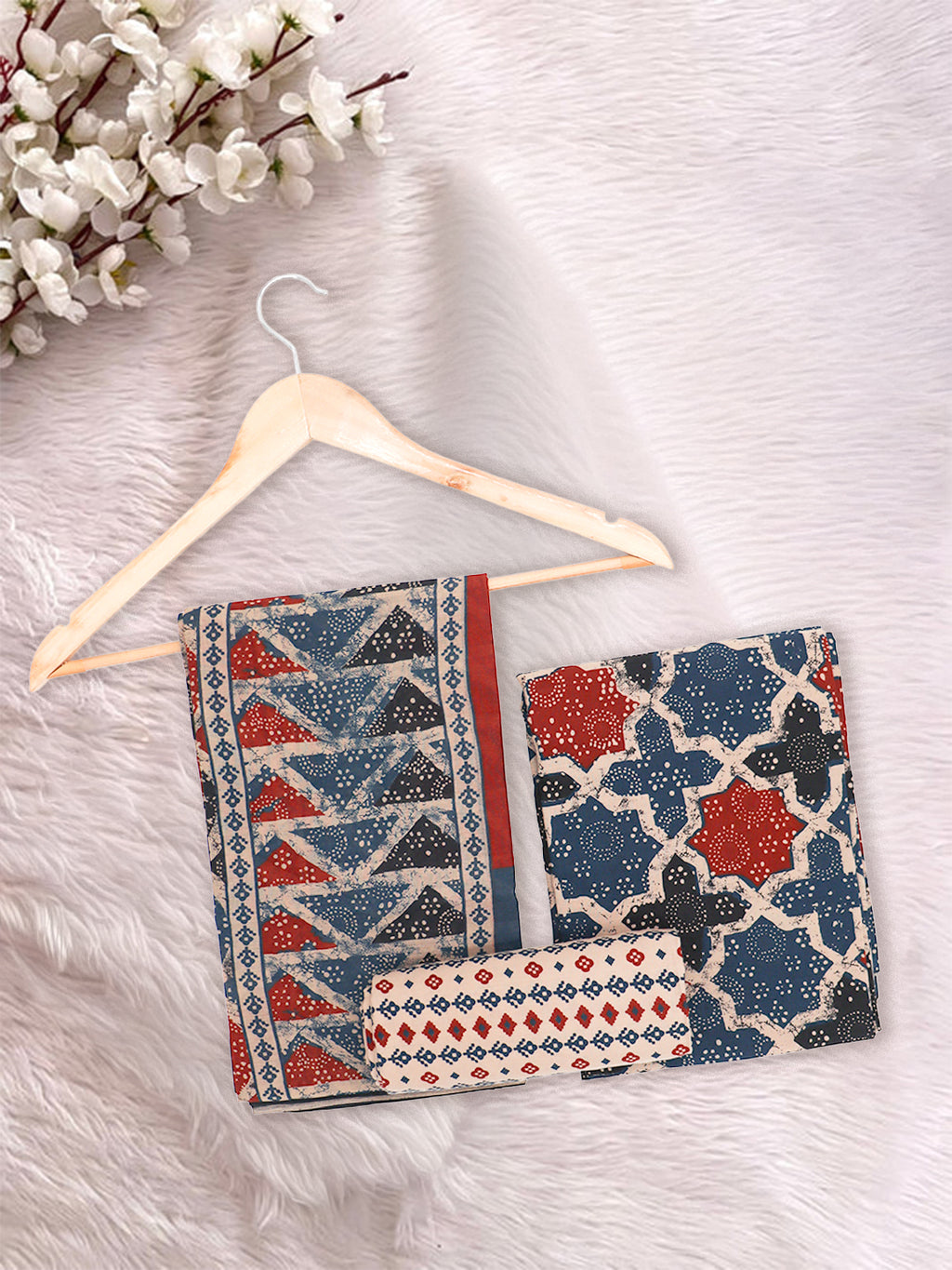Women’s Pure Cotton Printed Dress Material featuring Top, Pant, and Dupatta. Made from soft, breathable cotton for all-day comfort, this unstitched set is perfect for daily and casual wear. The elegant printed design and dark blue color offer a stylish yet versatile look, ideal for office or everyday use.