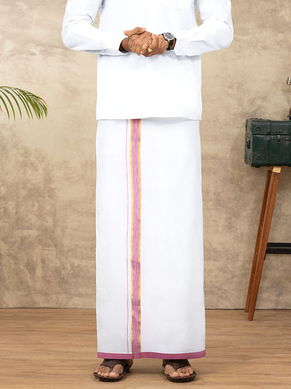 Men Cotton Blend Readymade Double Layer White Dhoti with Fancy Jari Border GFDA01