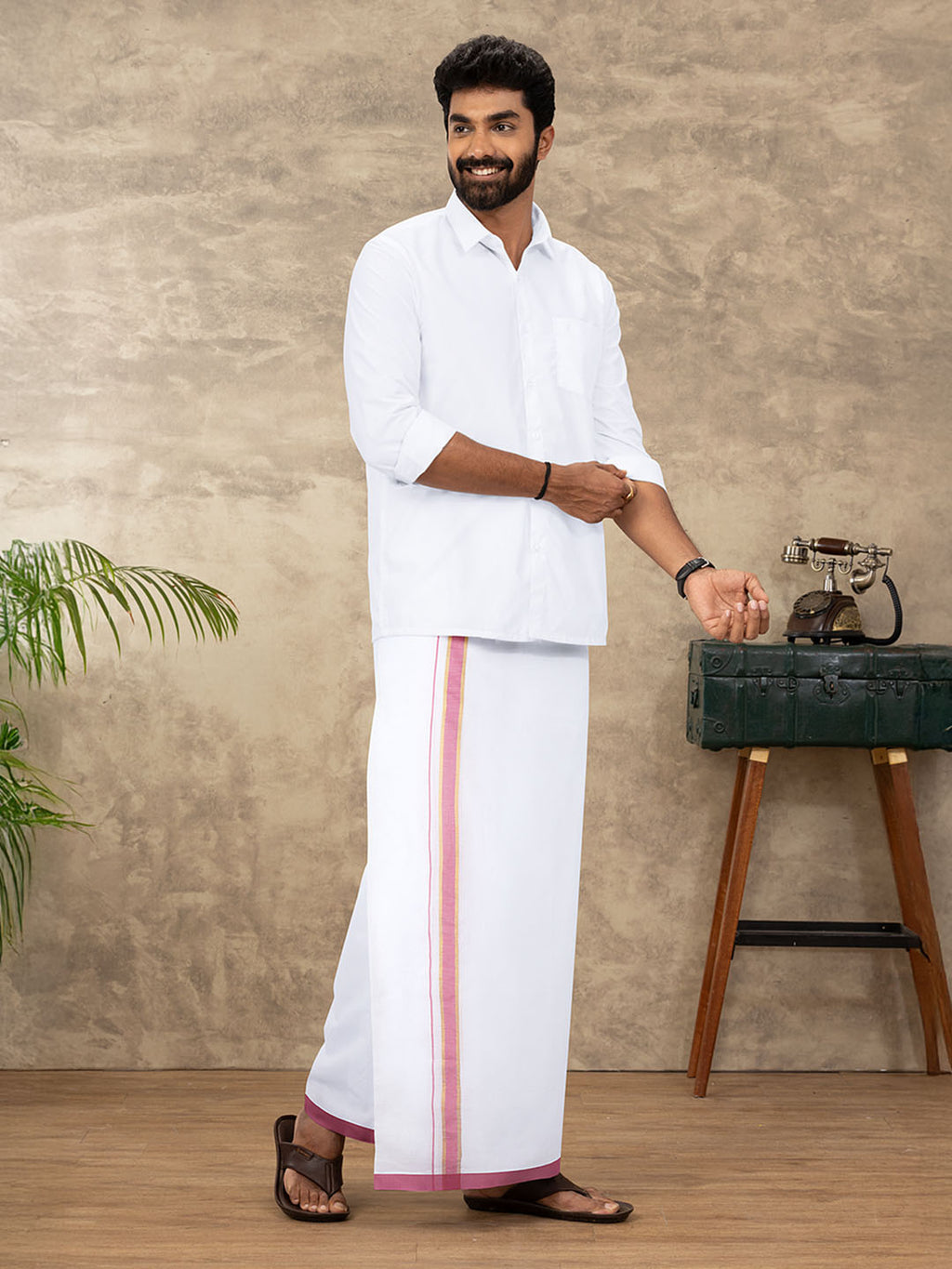 Men Cotton Blend Readymade Double Layer White Dhoti with Fancy Jari Border GFDA05