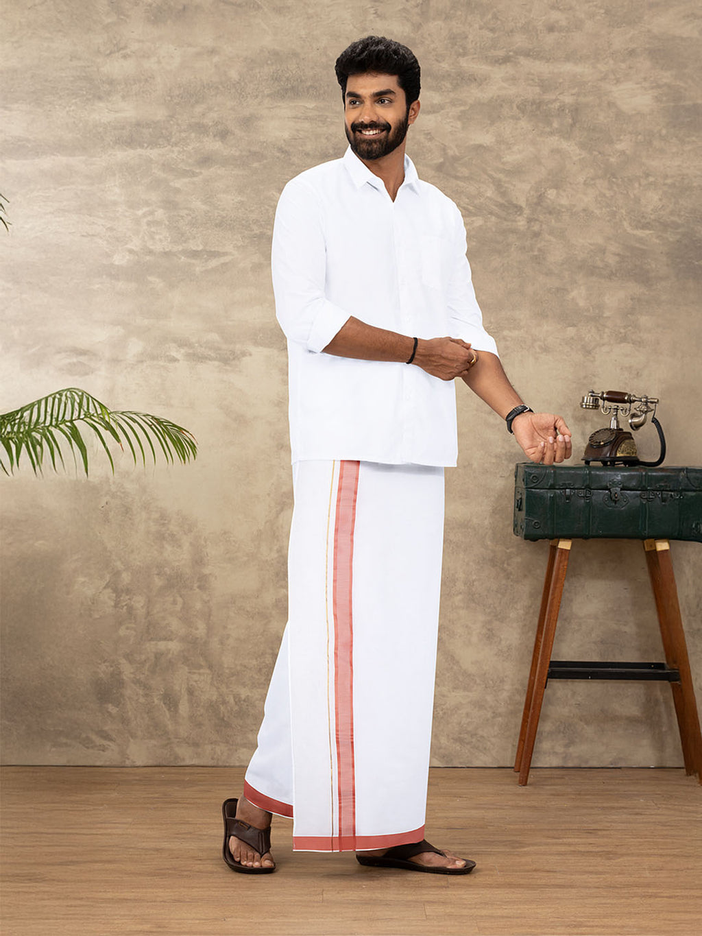 Men Cotton Blend Readymade Double Layer White Dhoti with Fancy Jari Border GFDA08