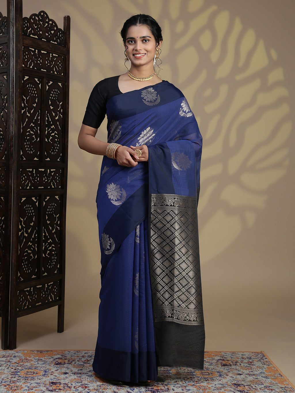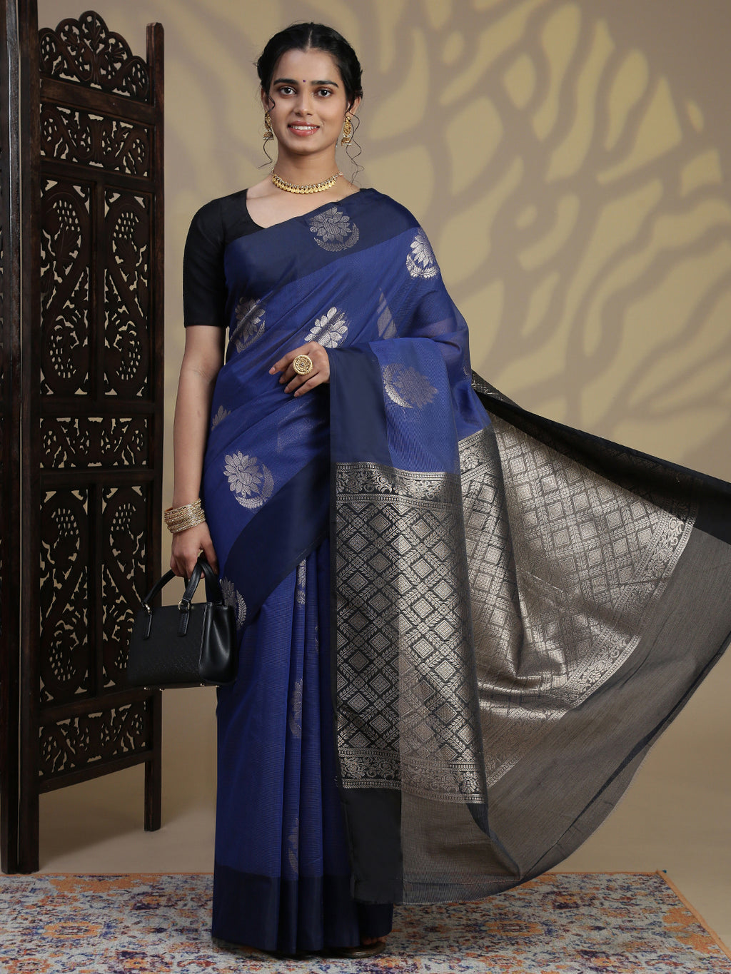 Women Dark Blue Kora Cotton Saree SK104