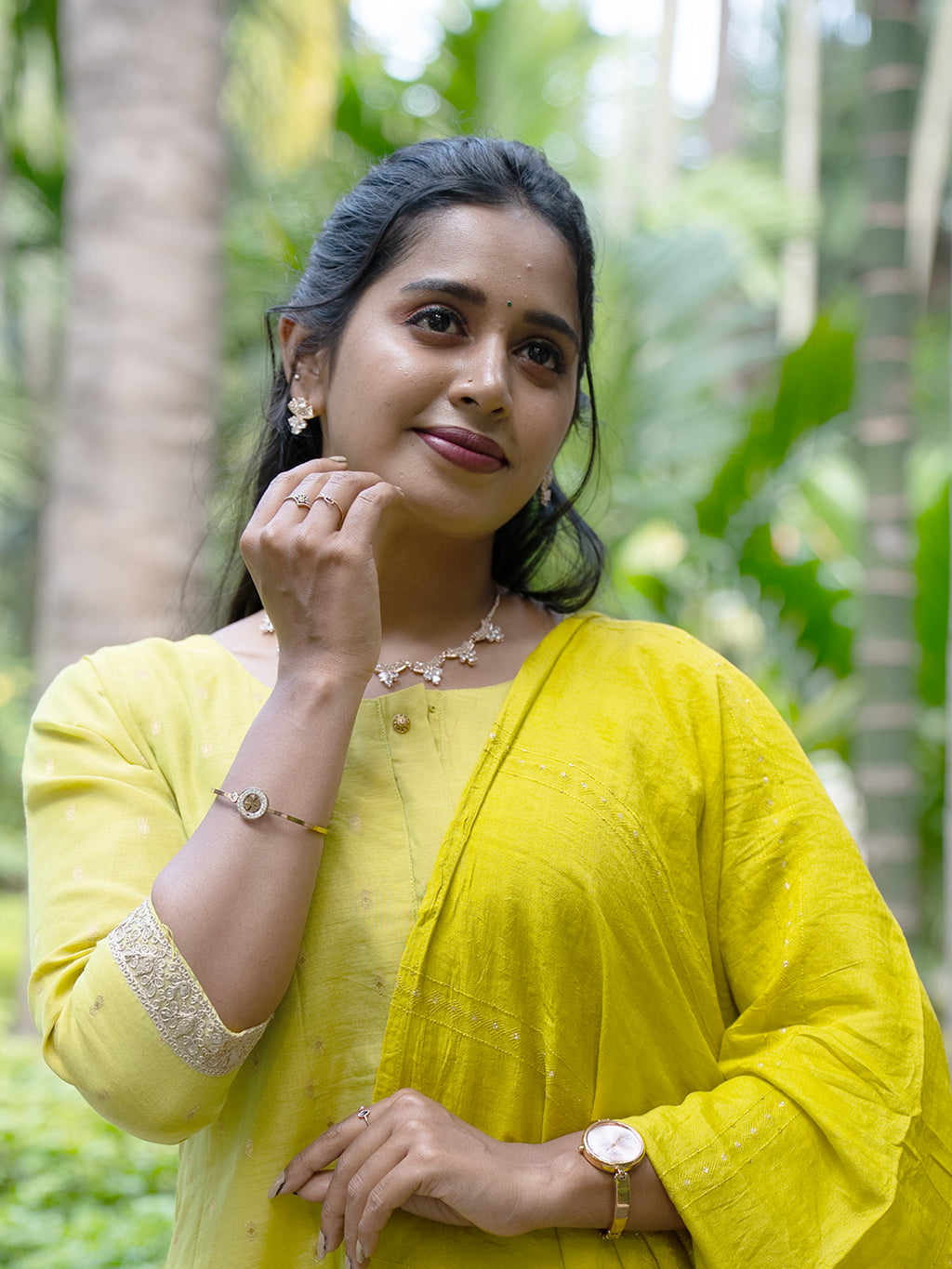 Step out in effortless elegance with this green cotton-mix weaving embroidered kurti set. The round neck and 3/4 sleeves offer a classic, comfortable silhouette. Intricate weaving and embroidery add rich texture and charm to its vibrant look. Finished with a side-closed design, it ensures a neat, structured, and graceful fit.