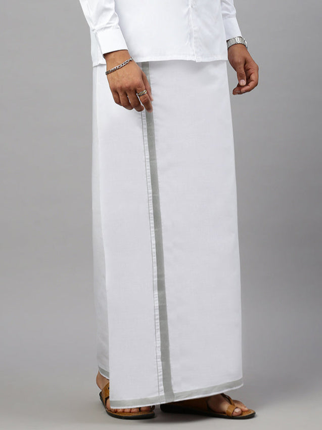 Men Cotton Blend Single Layer White Dhoti with 3/4" Silver Jari Border