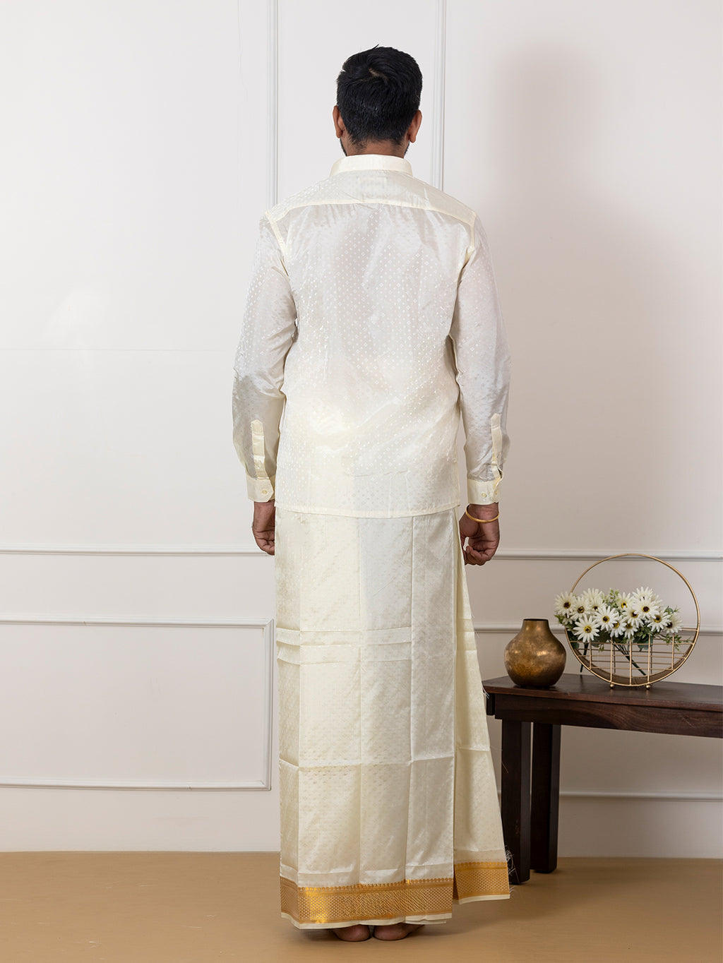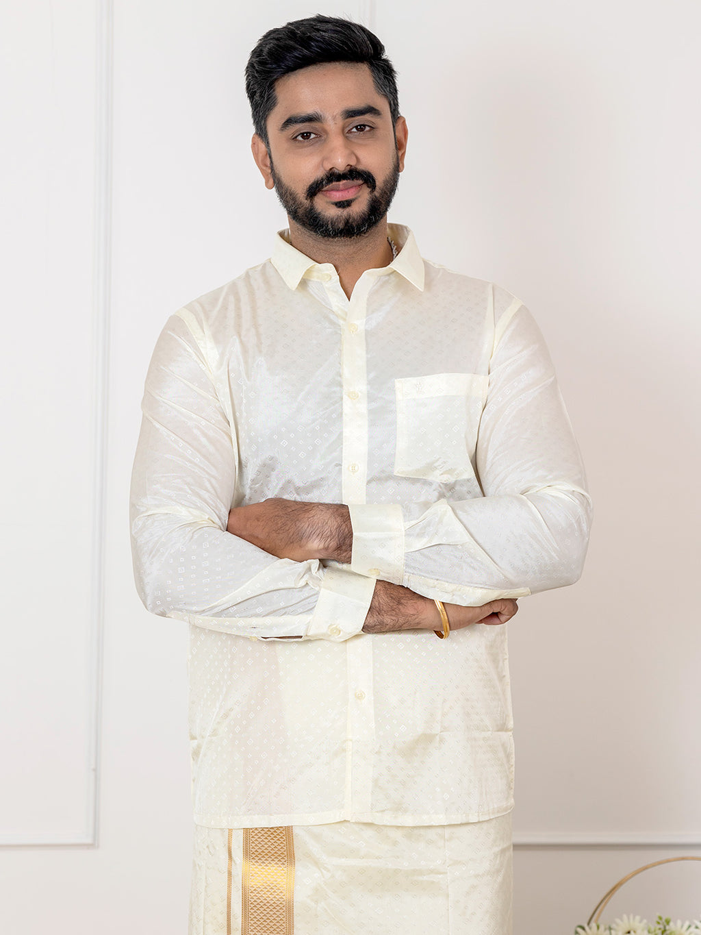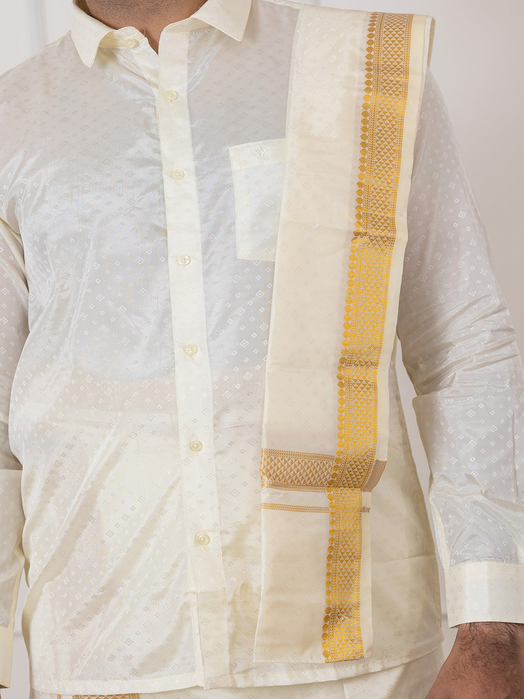 Men Art Silk Cream Self Design Shirt & Dhoti Towel Set Parinayam Grand CRJD1