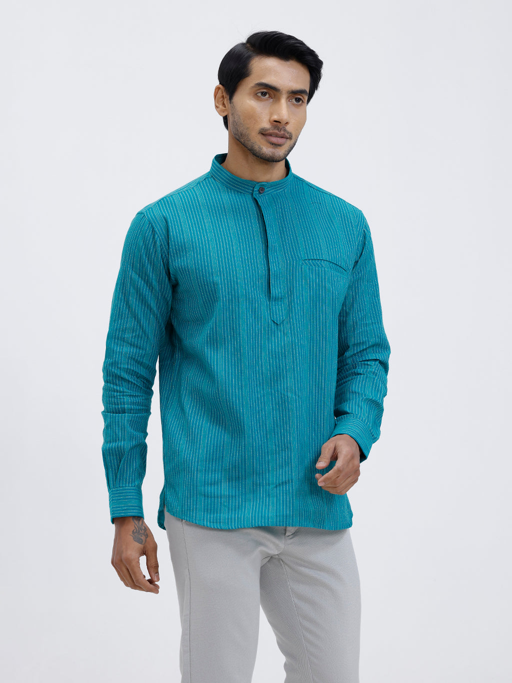 Men Cotton Short Length Striped Pocket Kurta Green RK56