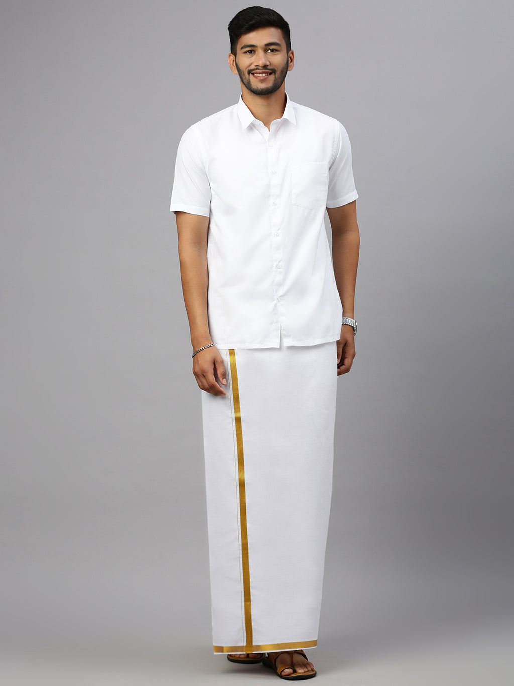 Men Formal Half Sleeve White Shirt with 1'' Inch Gold Jari Border Single Layer Dhoti Combo