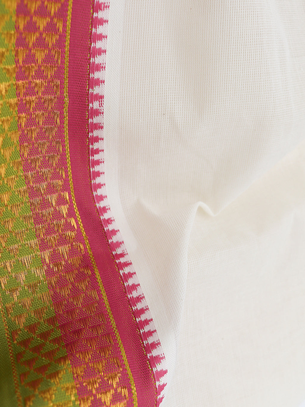Experience elegance and tradition with this Kora Cotton Panchakacham with Angavasthram Set, beautifully enhanced with a rich gold jari border. Crafted from premium Kora cotton, the fabric is lightweight, breathable, and naturally textured, offering a crisp and graceful drape throughout the day.
