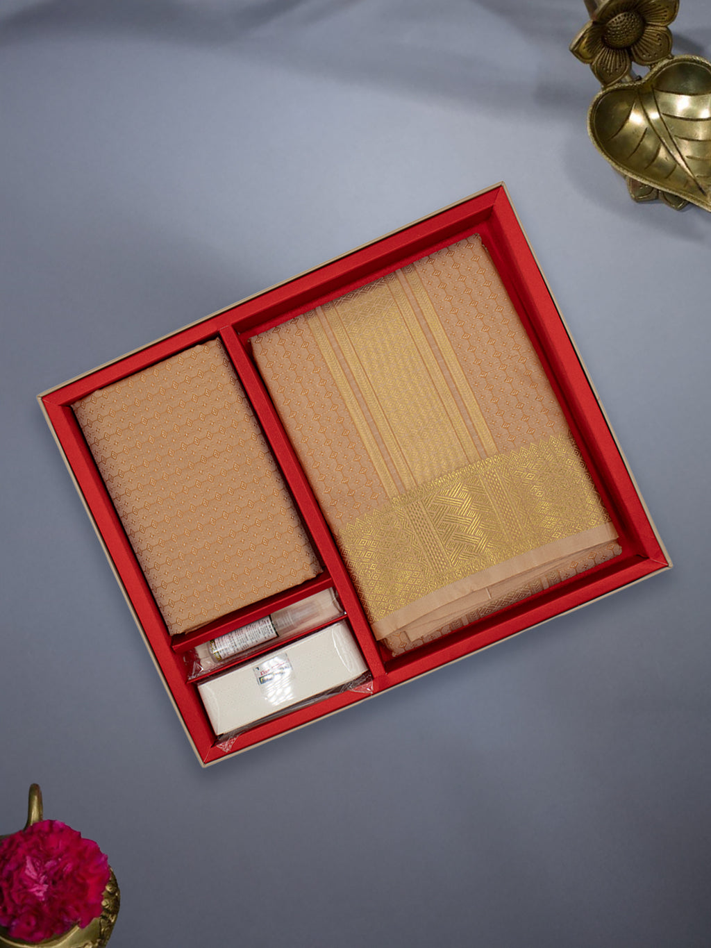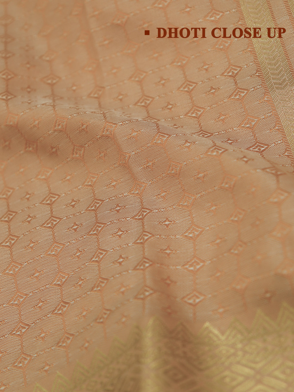 Elevate your traditional look with this Men’s Art Silk Dhoti & Shirting Set, featuring a rich self-design pattern and an elegant gold fancy jari border. Crafted from premium art silk for a smooth, lustrous finish, this set offers a perfect blend of comfort and style. Ideal for weddings, festive celebrations, and special occasions, it adds a refined touch to your ethnic wardrobe.