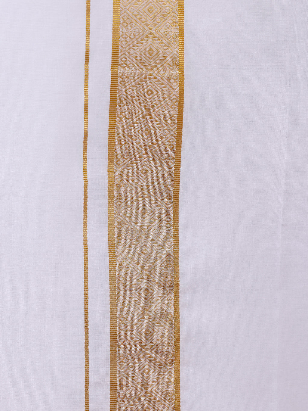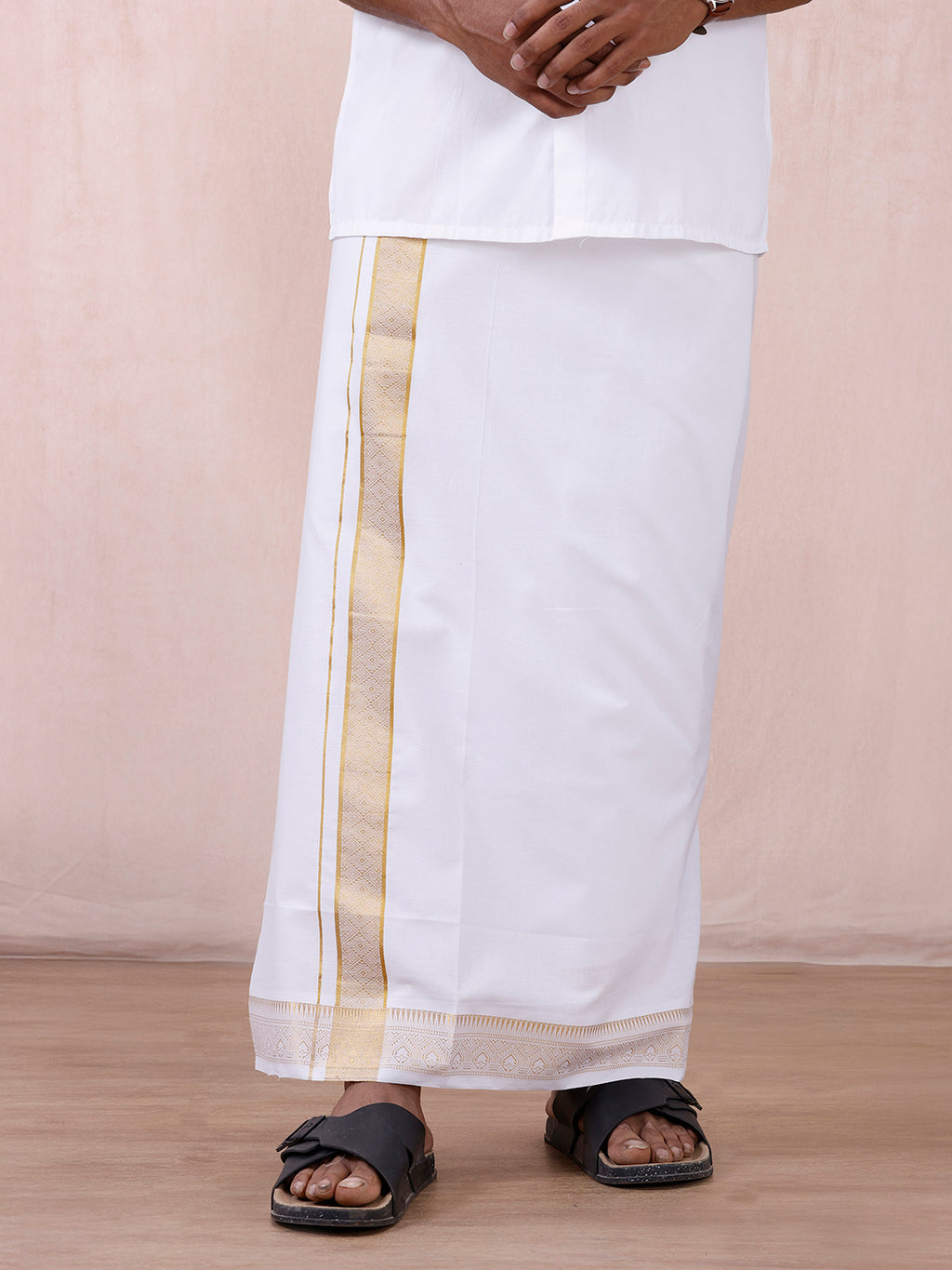 Men 100% Cotton Single Layer White Dhoti with Gold Jari Border Aura 351
