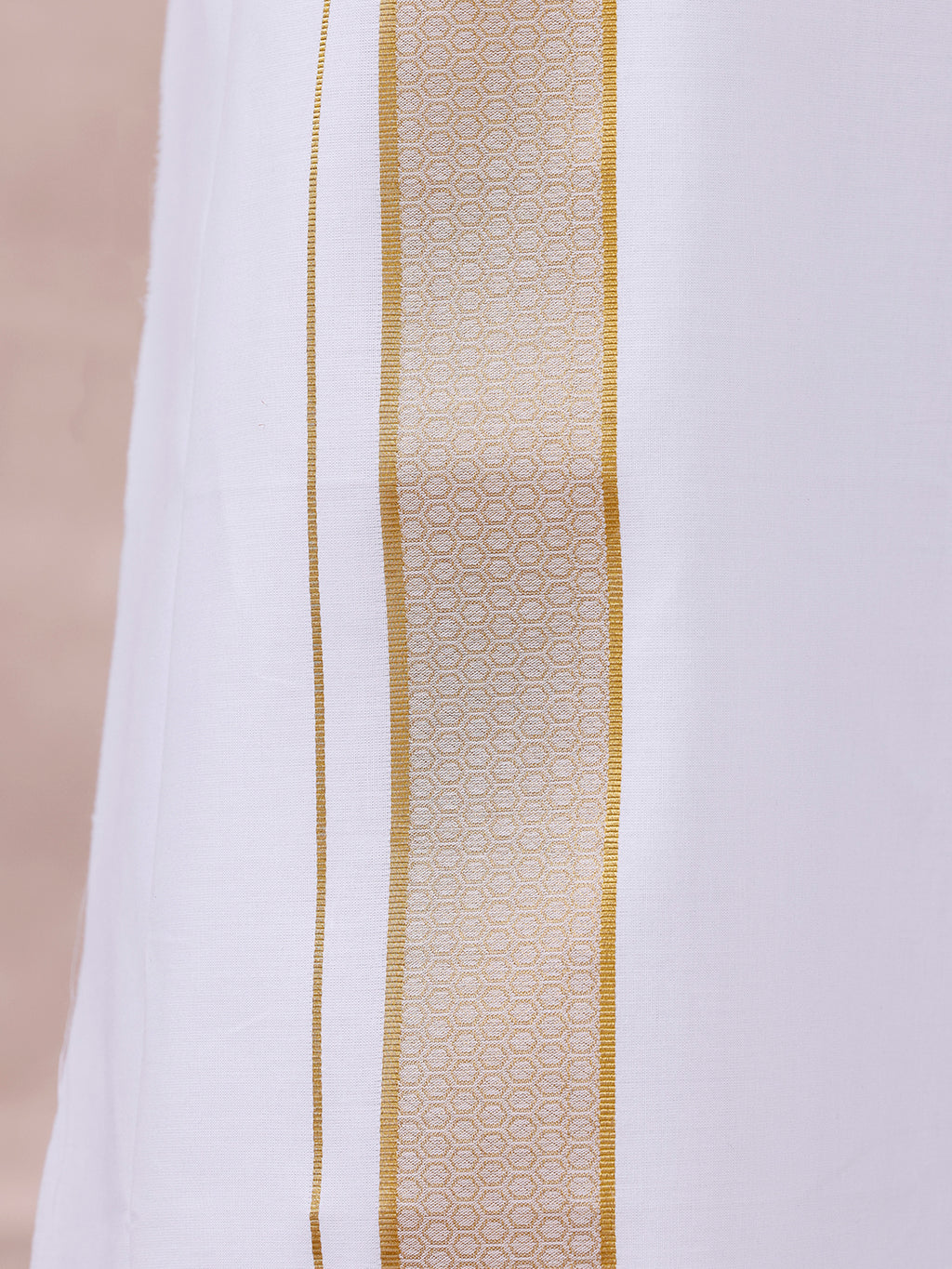 Men 100% Cotton Single Layer White Dhoti with Gold Jari Border Aura 367