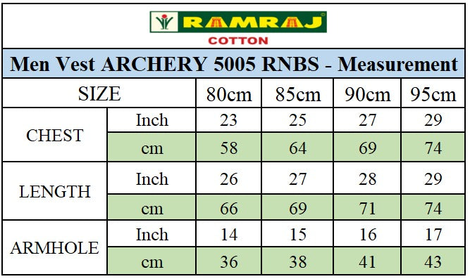 RAMRAJ Gym Vest RNBS Archery Vest Is Sweat Absorbent and skin friendly which keeps you fresh & clean round the clock.  Made from Gold Compact Cotton Ribbed fabric. Most Suitable Pattern and Fabric Flexibility for Exercise and Gym Work Outs. Designed specially to give out maximum comfort.  Designed specially to give out maximum comfort. The neck and armholes of this vest for men are strengthened with binding for durability. It is designed with a clean-finished bottom hem for style and contoured armholes for ease of movement.