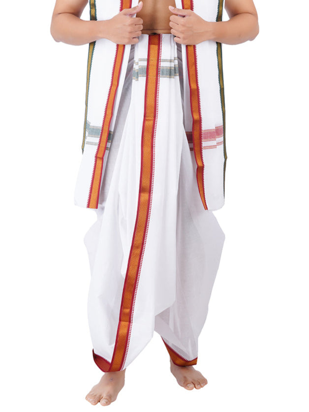 Panchakacham is a set of Dhoti (4 mtr) and Angavastram (2.25 mtr) in running material form. This Cotton White Dhoti with 5 Khan Mayilkhan Jari Pet Border gives rich elegant look and comfortable to wear. Suitable for Special occasions, Festivals and Rituals.