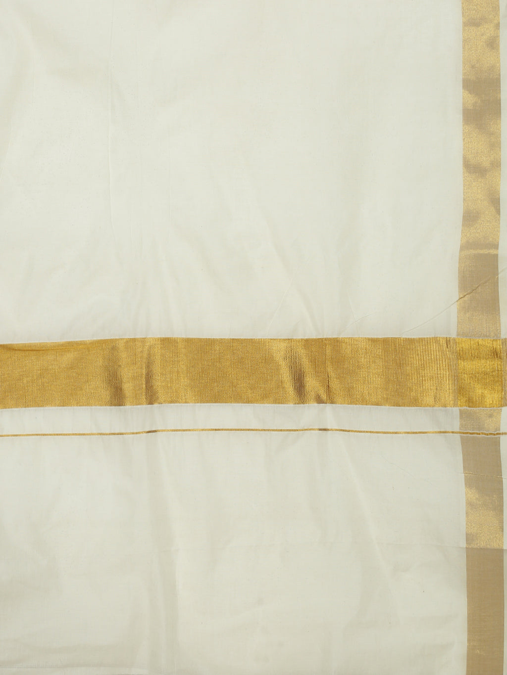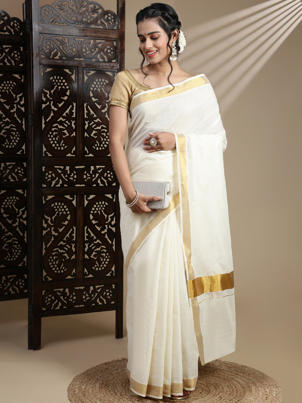 Women Traditional Kerala Cream Plain Saree with Gold Border KS222
