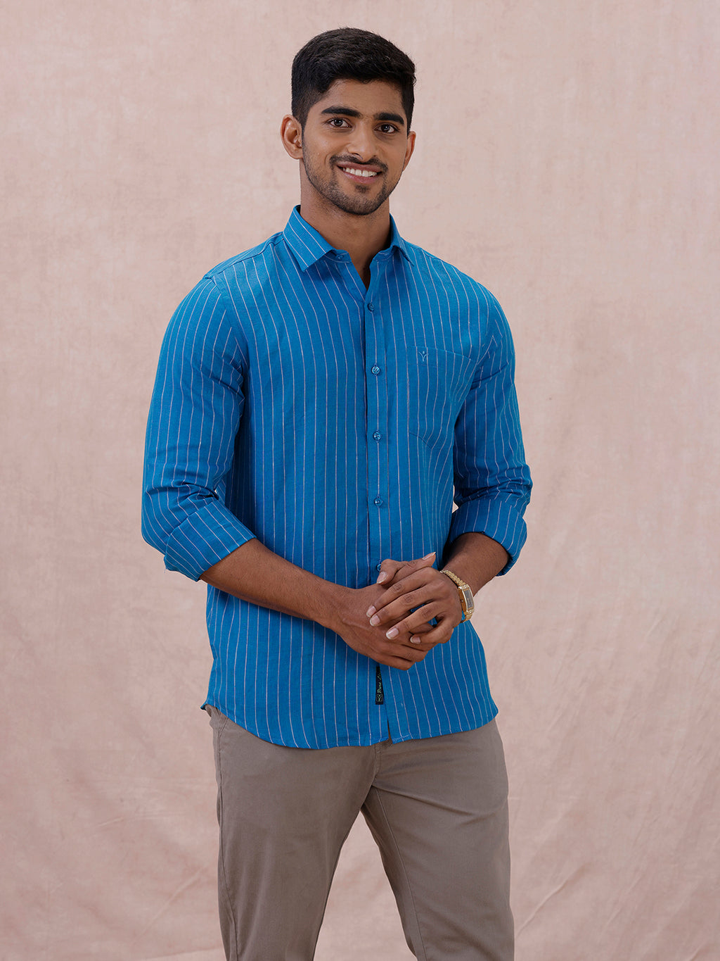 Men Pure Linen Striped Shirt Tufts Blue LS11