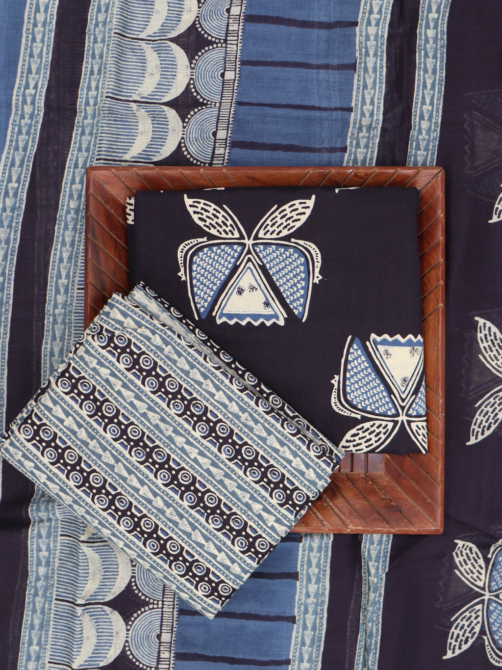 Women Pure Cotton Printed Dress Material Blue with Black DM349