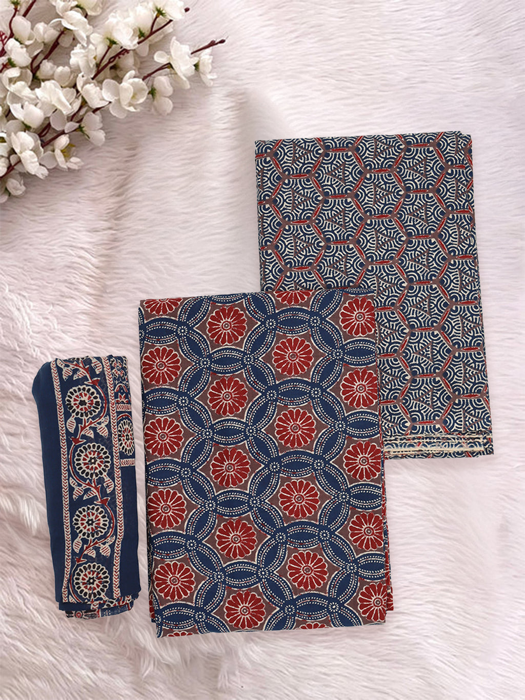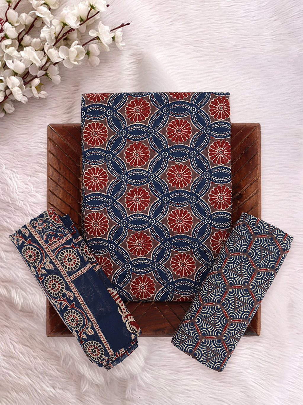 Women’s Pure Cotton Printed Dress Material featuring Top, Pant, and Dupatta. Made from soft, breathable cotton for all-day comfort, this unstitched set is perfect for daily and casual wear. The elegant printed design and dark blue color offer a stylish yet versatile look, ideal for office or everyday use.
