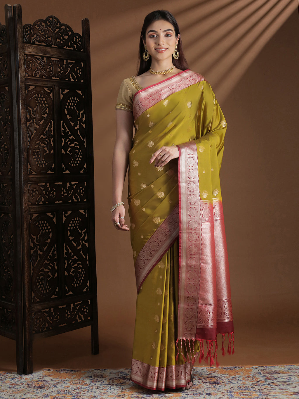 • Saree  Colour      : Mustard Yellow with Pink