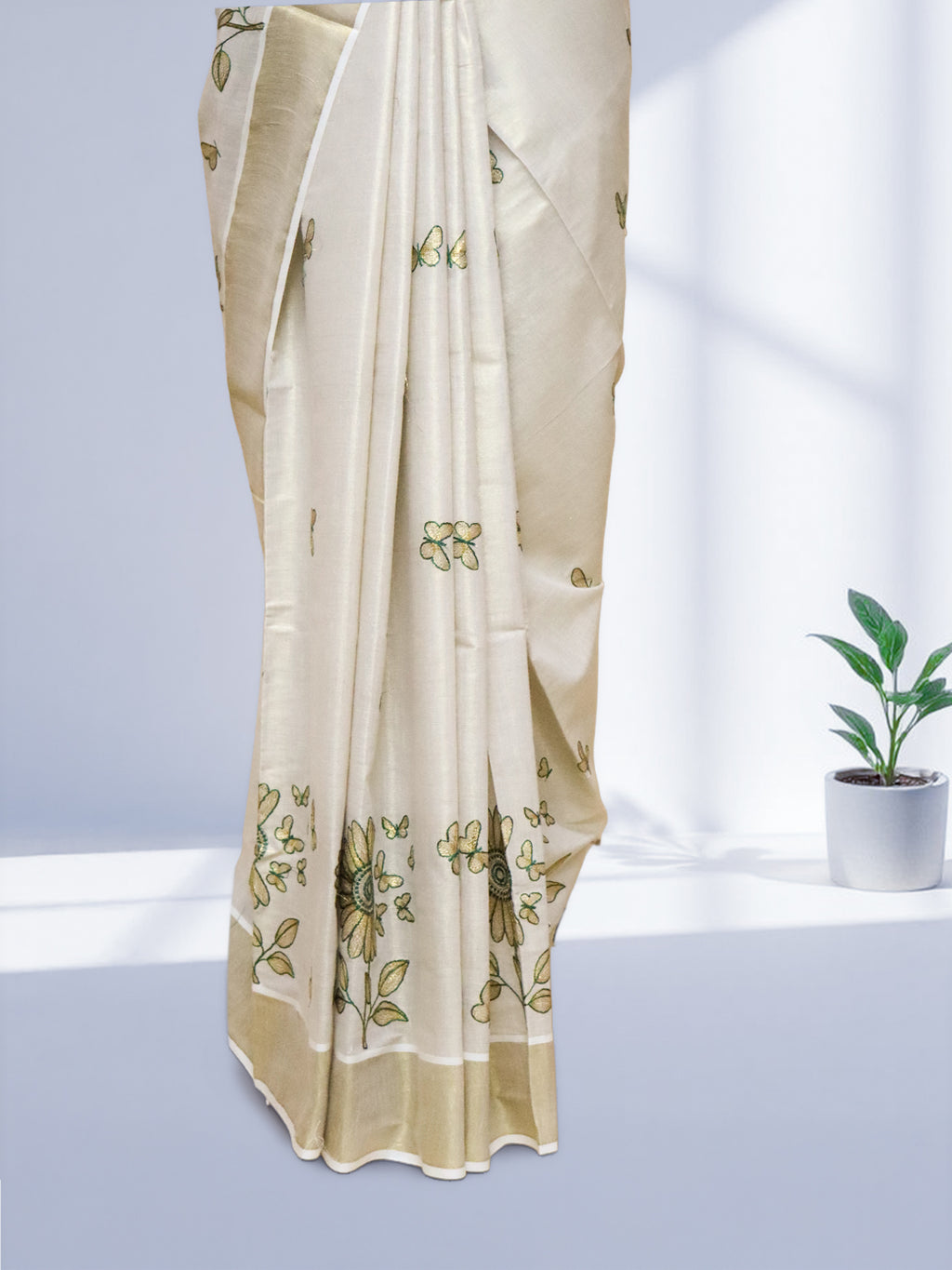 Women Kerala Tissue Gold Embroidery Saree KS214