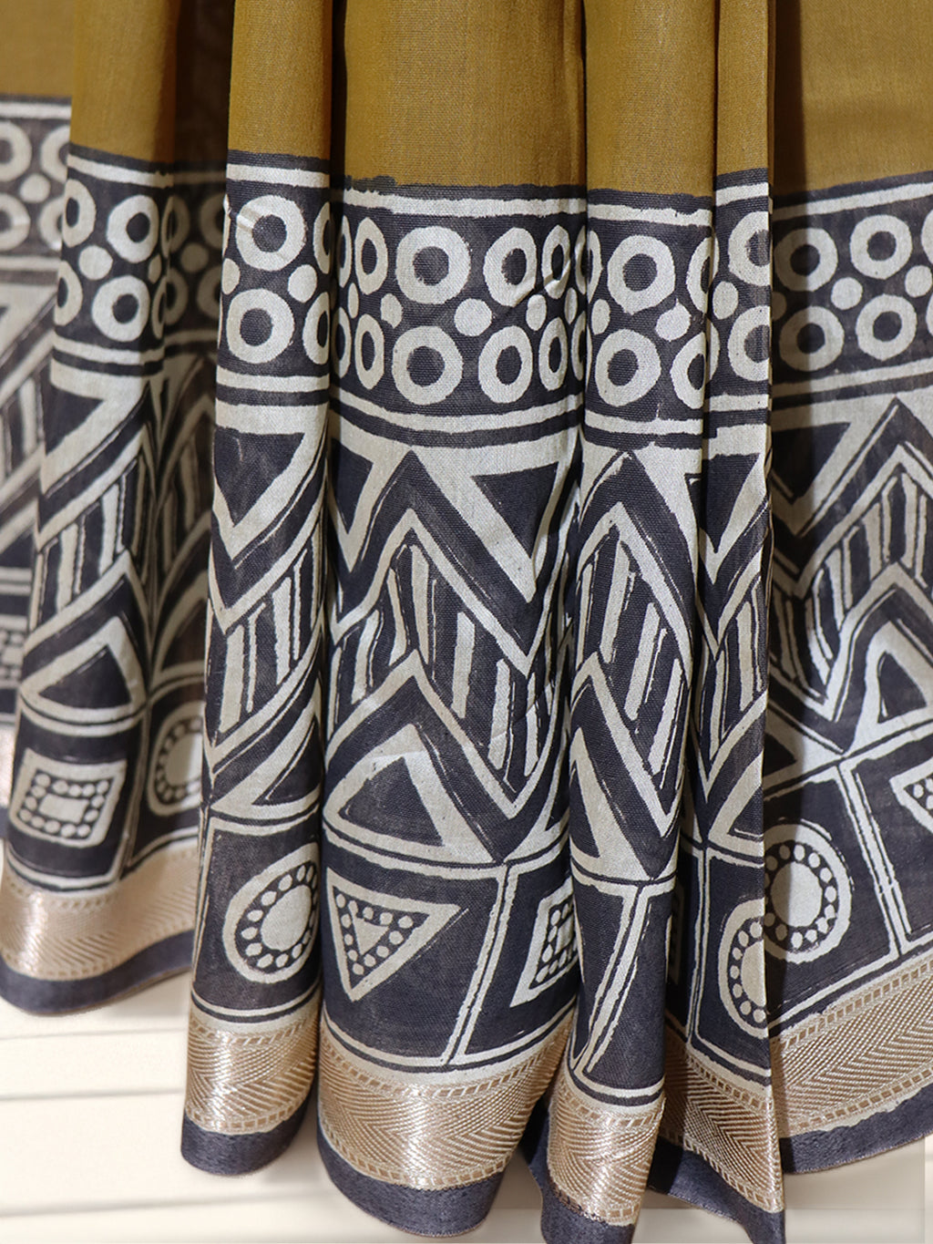 Women Mustard Green Semi Chanderi Cotton Printed Saree SC81
