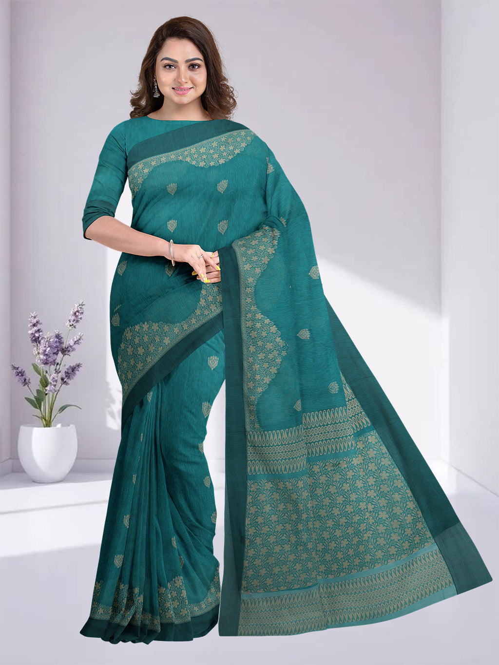 Experience timeless elegance with this Women’s Kora Cotton Saree. Made from soft, airy Kora cotton, it offers a comfortable fit and beautiful drape, perfect for both special occasions and casual wear. The saree includes an unstitched blouse piece, allowing you to personalize your look with ease.