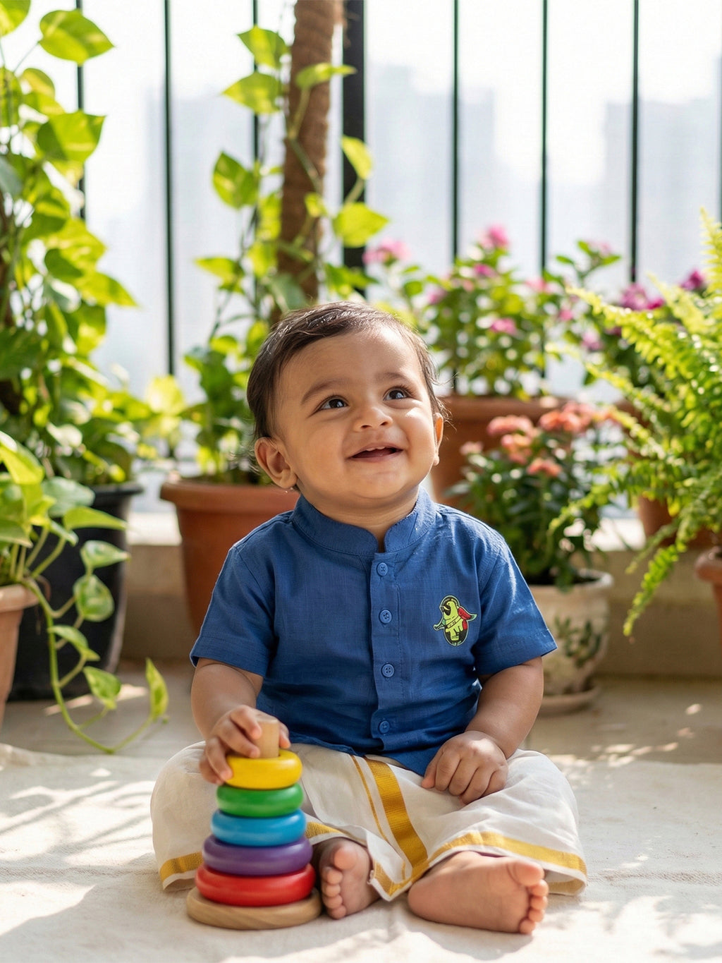 A Newborn Baby Traditional Shirt with Dhoti and Panchakacham Set is an exquisite outfit designed for infant boys, perfect for religious ceremonies, family weddings, and other special occasions. The set typically includes a soft, comfortable traditional shirt made from breathable fabrics like cottonIdeal for events like naming ceremonies, first birthday celebrations, or family weddings, this traditional attire allows your little one to look adorable while honoring cultural traditions. The set blends timeless Indian elegance with modern convenience, making it both practical and festive for your baby’s special moments.