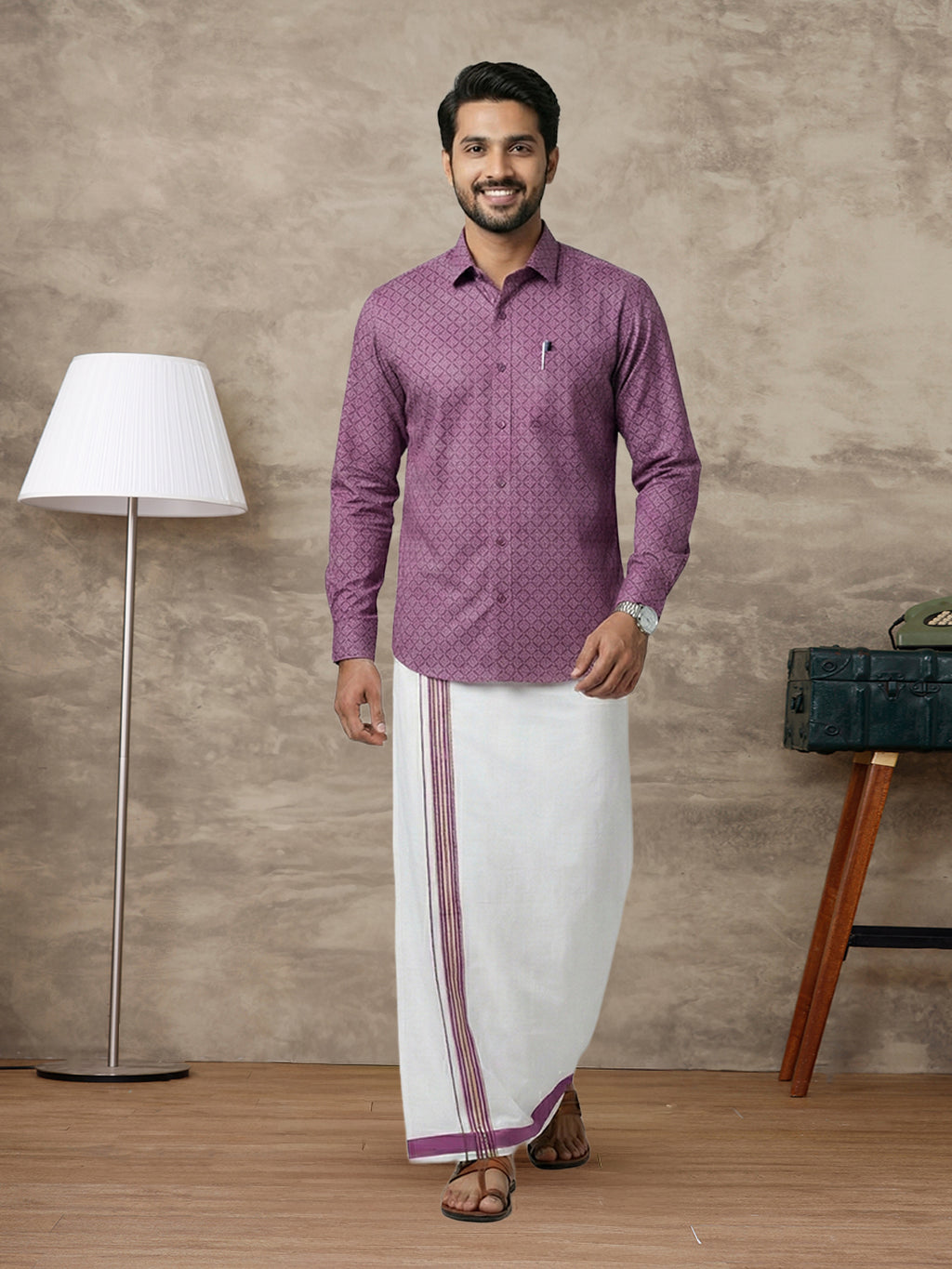 Like Father Like Son Matching Border Dhoti with Printed Shirt Combo Set Dark Magenta PS28