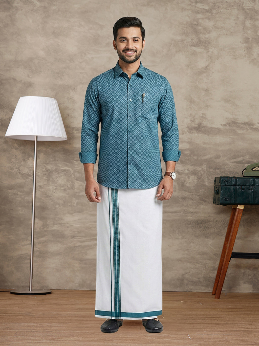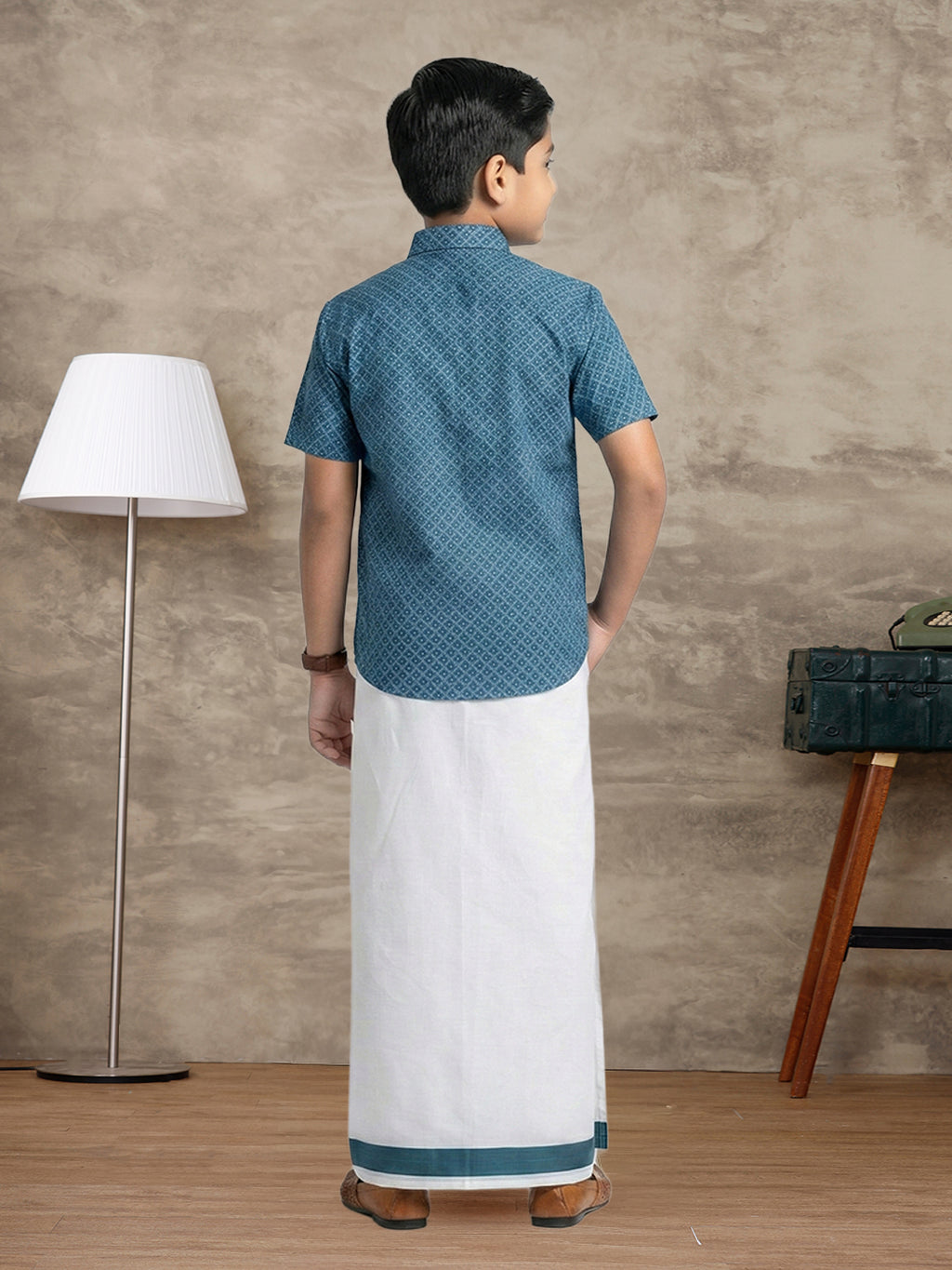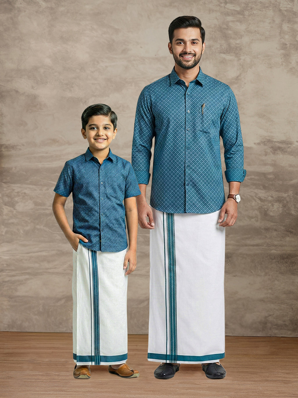 Like Father Like Son Matching Border Dhoti with Printed Shirt Combo Set Teal Blue PS27