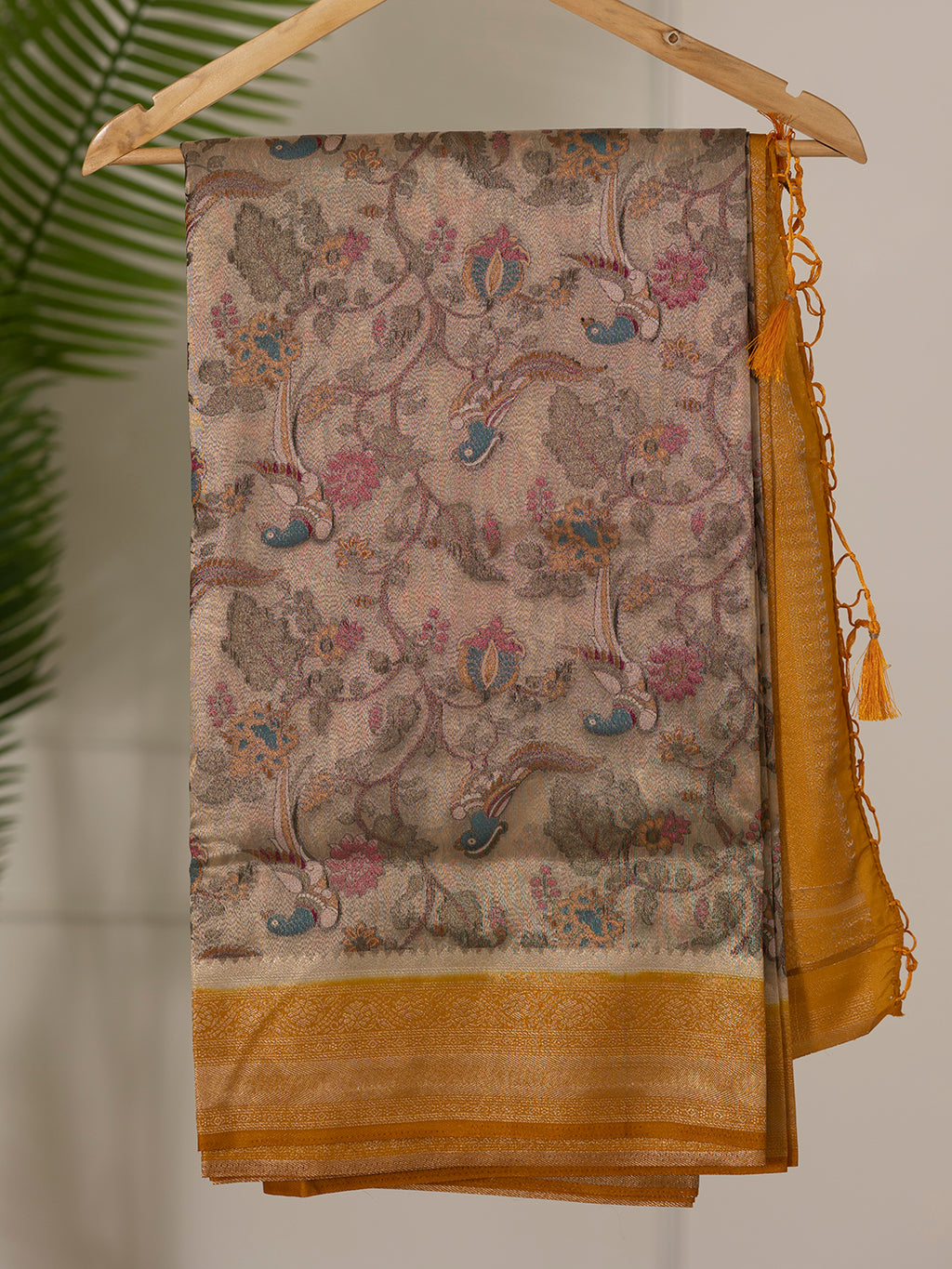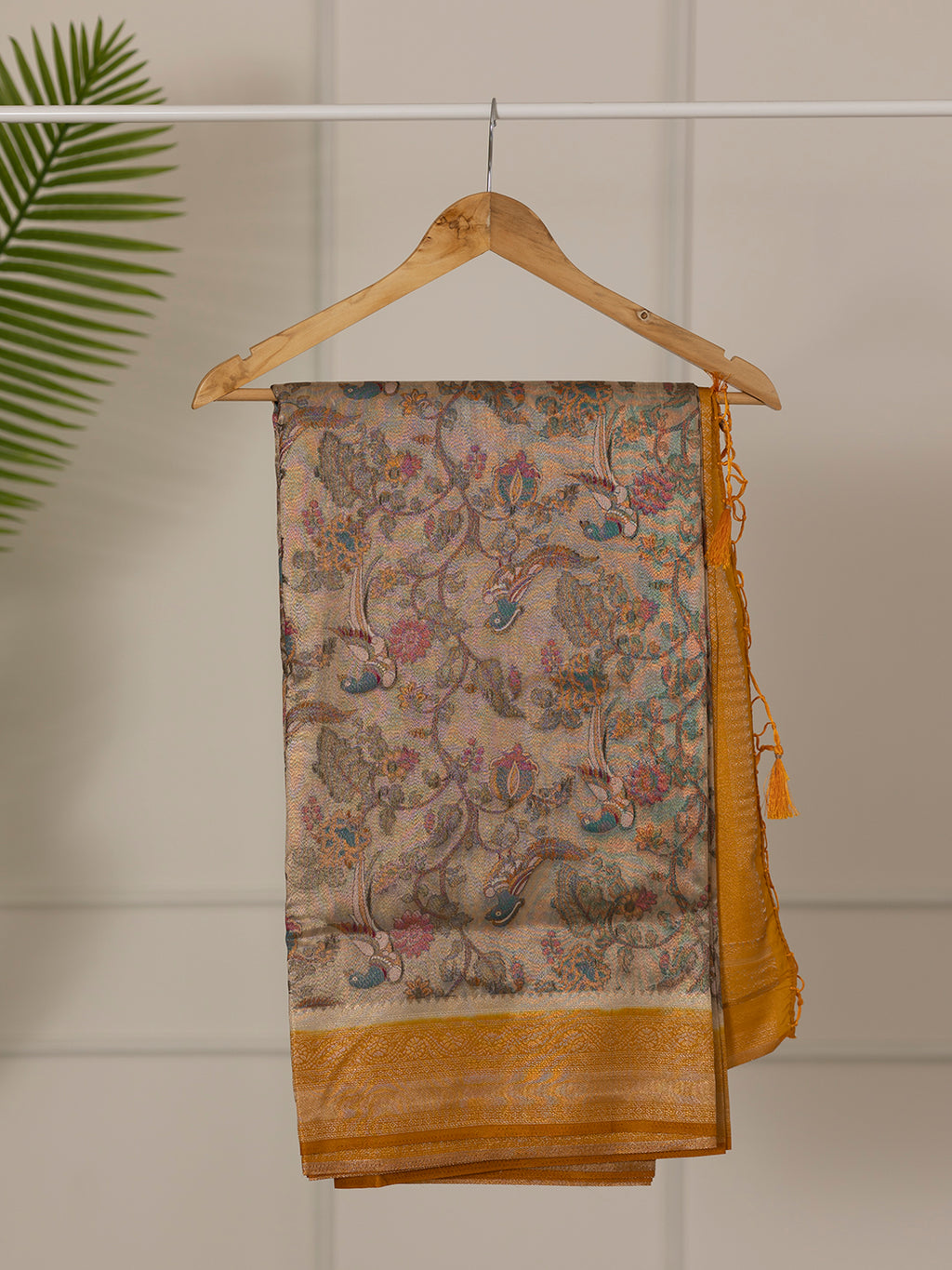 Experience the perfect harmony of tradition and luxury with our tissue silk saree. Crafted from the finest silk threads intricately woven with shimmering zari, this saree exudes a delicate glow that enhances your presence at every special occasion.